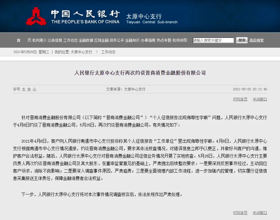 针对晋商消费金融股份有限公司(以下简称“晋商消费金融公司”)“个人征信报告出现侮辱性字眼”问题,人民银行太原中心支行于4月8日约谈了晋商消费金融公司,5月25日,再次约谈晋商消费金融公司。有关情况如下: