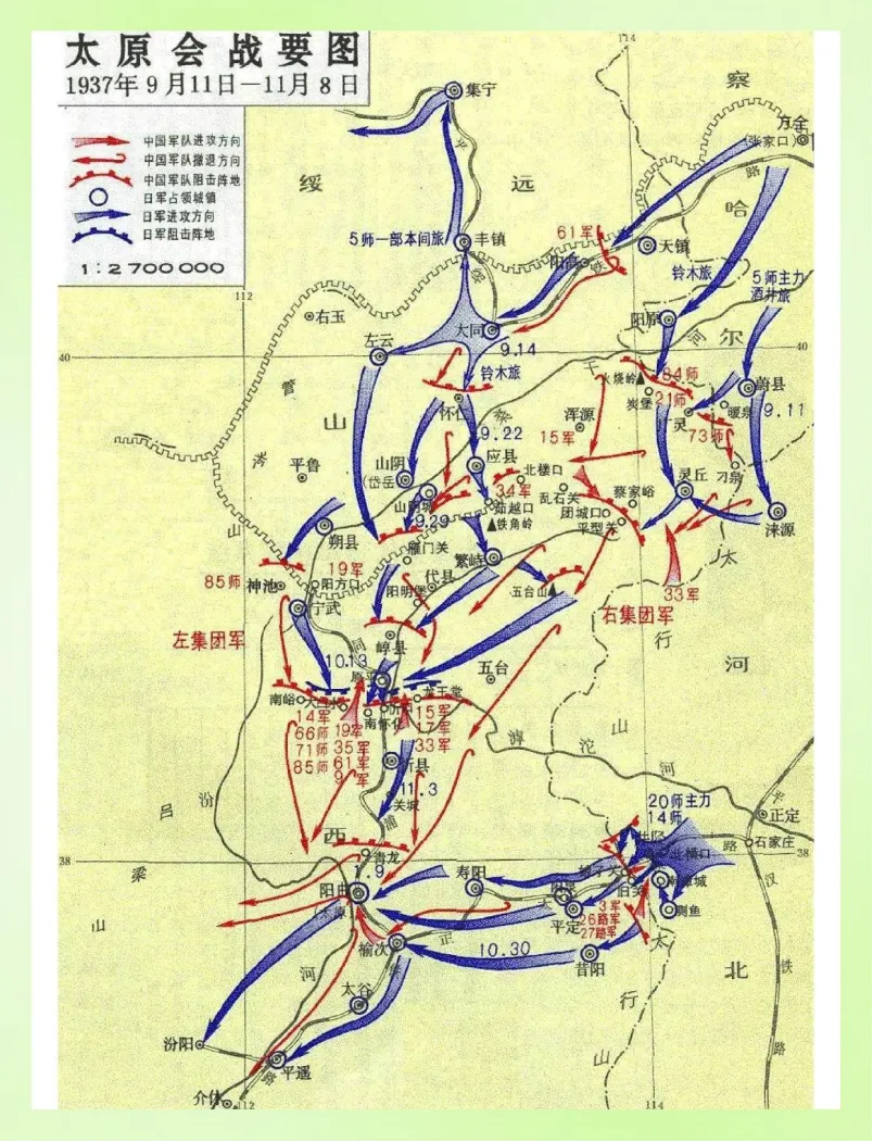 (1)战前态势:平型关失利后,日军增兵华北,第5师团与第20师团一部会攻忻口(太原以北门户,忻口失守则太原无险可守)。第二战区集中主力(晋绥军、中央军共13个师)在忻口正面设防,八路军在敌后袭扰日军交通线。