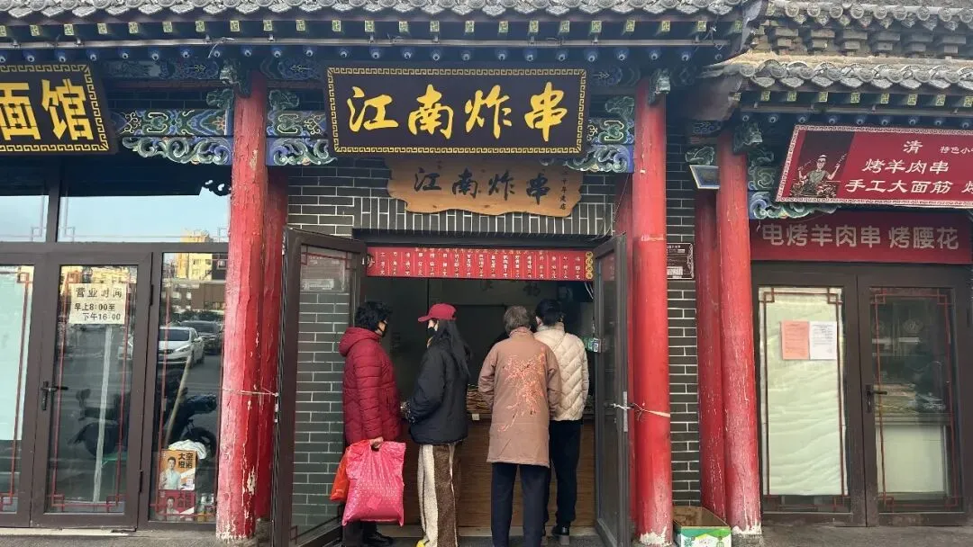 五一路与海子边街交汇处,红色中式门头并不显眼,门口却常有人排队等候。这家名叫“江南炸串”的小店,在五一广场西北角一开就是二十多年。