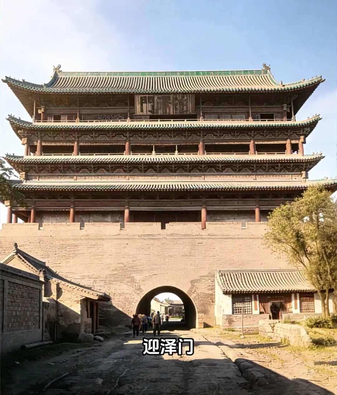 迎泽门是明代太原城南城墙上的重要城门,也是如今太原“迎泽”地名的来源。虽然照片中的建筑外观宏伟,但需要说明的是,历史上的迎泽门已于1955年因城市改造被拆除,目前照片中所见的很可能是后世复建或影视/艺术创作中的形象,用以还原其历史风貌。