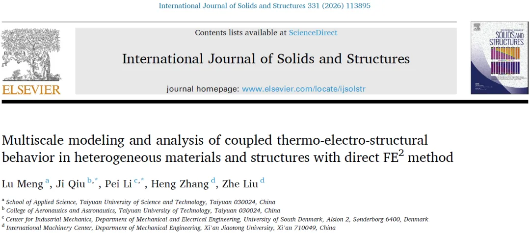 Meng L, Qiu J, Li P, Zhang H, Liu Z. Multiscale modeling and analysis of coupled thermo-electro-structural behavior in heterogeneous materials and structures with direct FE² method[J]. International Journal of Solids and Structures, 2026, 331: 113895.