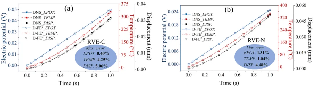图2:DNS模型与 D-FE²模型预测的点(a)C和点(b)N处的电势、温度与位移变化趋势