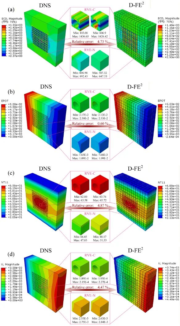 图3:DNS模型与 D-FE²模型预测的(a)电流密度、(b)电势、(c)温度与(d)位移分布云图