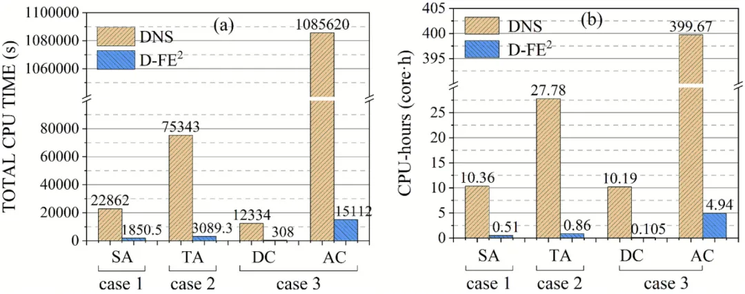 颠覆性计算效率:与DNS相比,D-FE²方法的内在计算工作量(TCT)减少了91%以上,实际计算资源消耗(CPU小时数)节省了95%以上,其优势在大规模模型中更为显著。