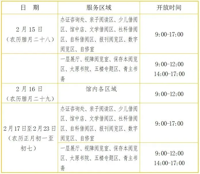 根据《国务院办公厅关于2026年部分节假日安排的通知》,春节假日为2月15日至2月23日,共9天。现将太原市图书馆2026年春节期间具体开放时间、服务内容安排如下: