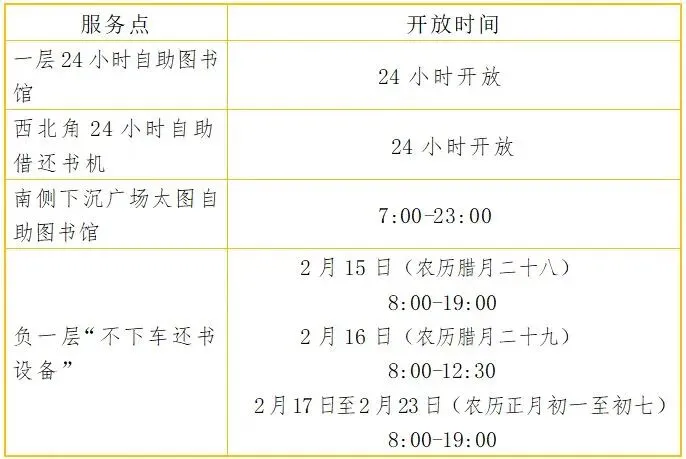 2月15日(腊月二十八)、2月22日(正月初六)、2月23日(正月初七)三层少儿阅览室,一层自助办证区、借还书区(综合、幼儿)、数字借阅区、自习区、培德堂,二层、四层展览区正常开放。(开馆时间上午8:00—12:00,下午2:30—6:00)