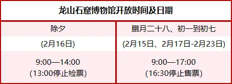 2月15日(腊月二十八)、2月17日至23日(正月初一至初七)正常开放,开放时间为9:00-17:00,16:00停止检票。请合理安排参观时间。