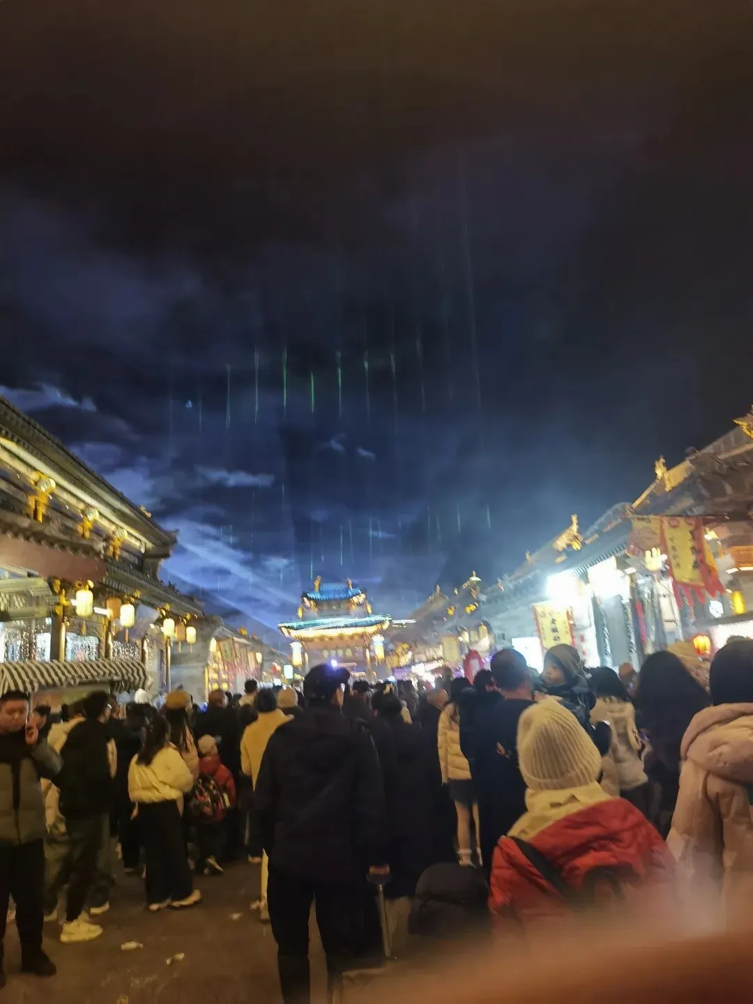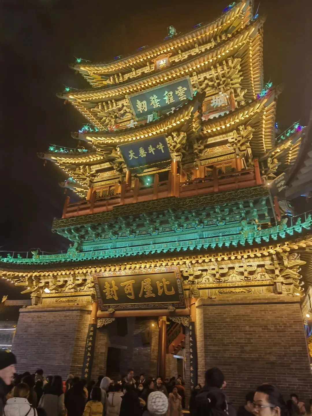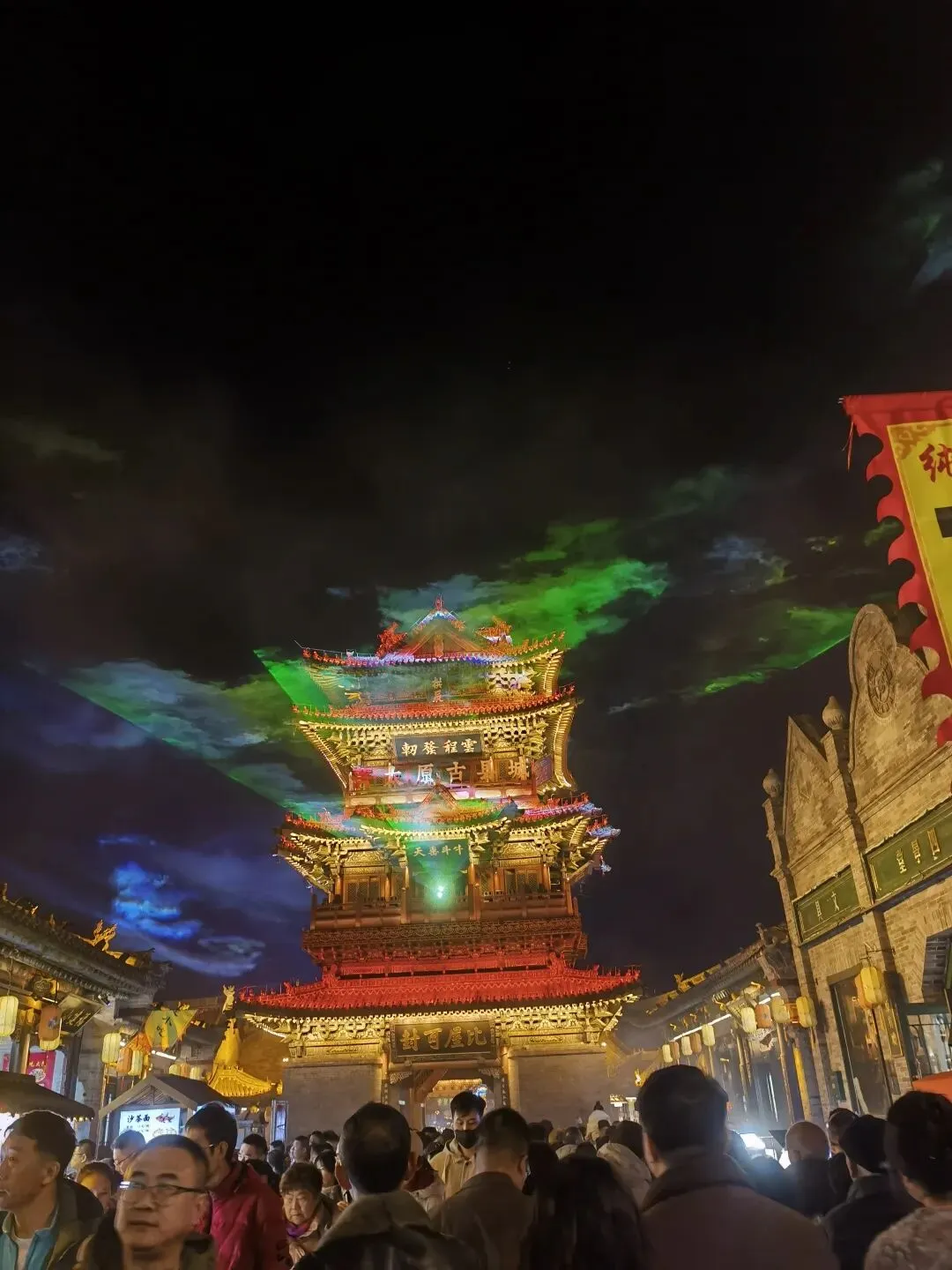 当天晚上我们去了太原古县城,正逢新春,城中灯火辉煌,游人摩肩接踵,这个占地面积1.25平方公里的景区,有无人机表演,有激光秀,还有各种歌舞、民俗表演,居然不要门票。光与影将巍峨的门楼装点得云雾缥缈,远远望去恍如仙境。在这里,我见到了规模和形制最大的一个城隍庙,豆包说明洪武八年太原古县城筑城,城隍庙随之在南街东段城隍庙街营建,坐北朝南,占地约28560平方米,规制与县署正衙同格。现在的城隍庙是2008年开始修复,2010年完工,按明洪武八年官式规制重建