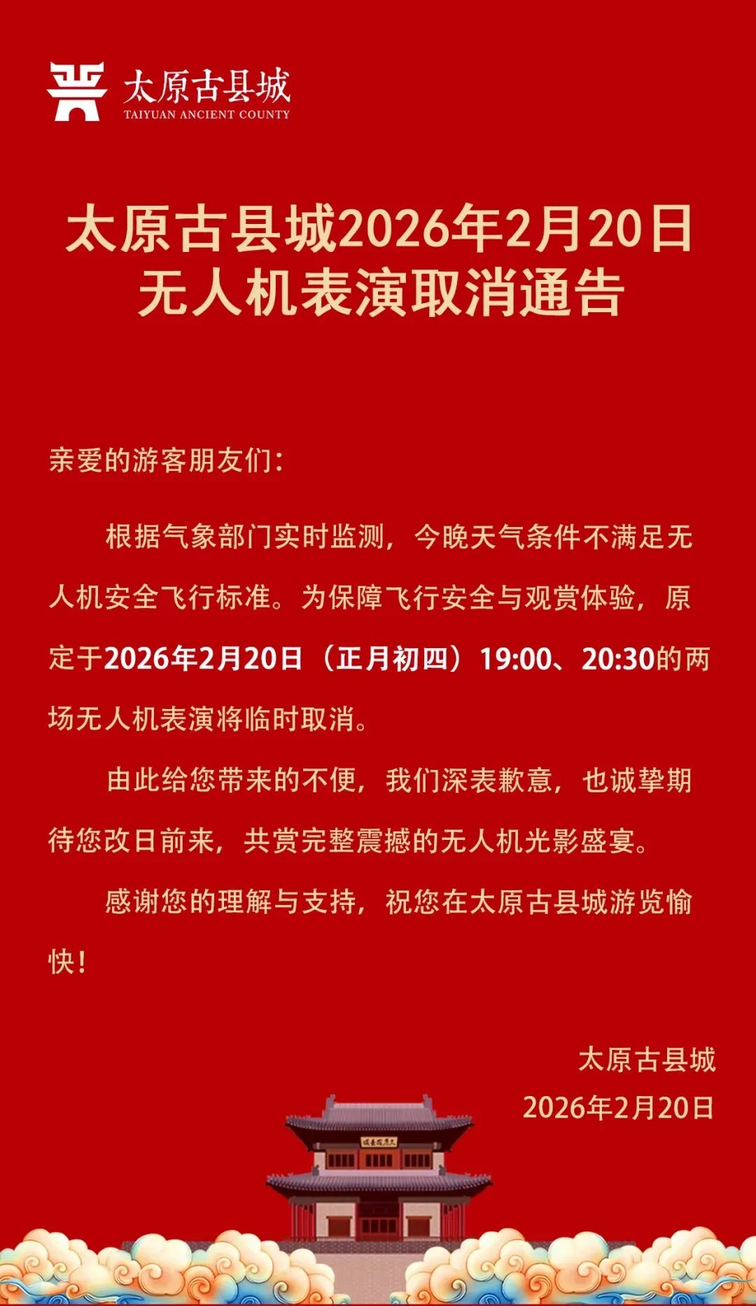 >太原古县城2026年2月20日无人机表演取消通告