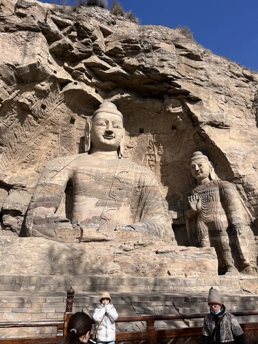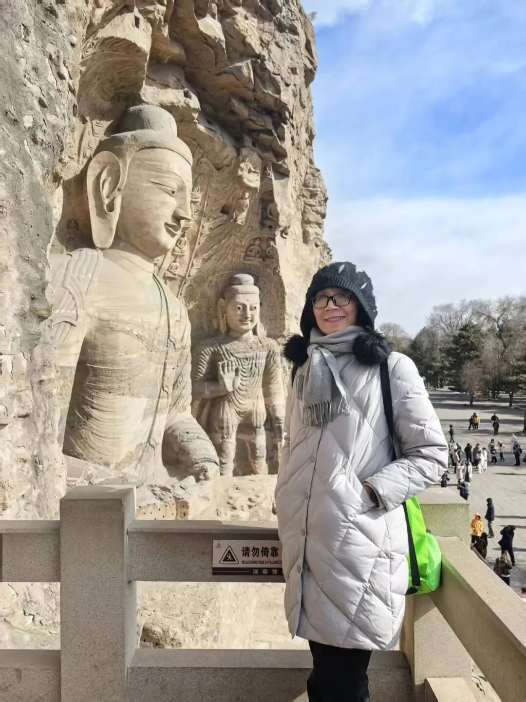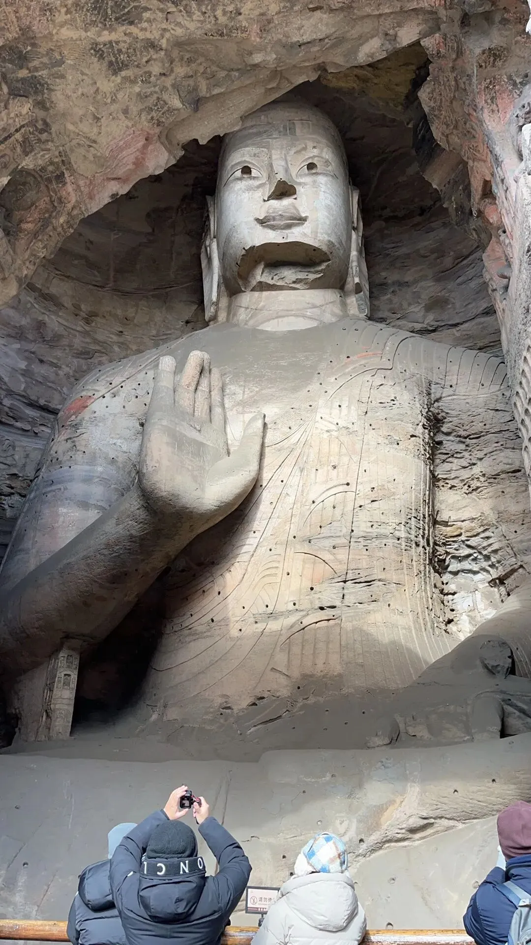 2月7号,今天是重头戏,游云冈石窟,留出一天的时间。一早就网约了车出发了,现在的网约车既方便又安全,价格公道透明。两三分钟之内就到了,一路上,大同的街道宽敞,出乎意外地干净,丝毫不差于做为全国卫生城市的威海,虽说是冬天,路边的绿化树和灌木也看出是有人修剪维护过的,最难得的是大同的马路,把机动车和非机动车用绿化带分割开来,并且都很宽敞,有的又加上人行道。而这一切都归功于当年的大同市市长耿彦波,从网上了解到,耿彦波市长推倒旧城重建新城颇有争议,但是当地的老百姓都非常赞成爱戴他们的这位市长,没有他,大同仍旧是那个灰土土的脏兮兮的煤炭城市,而现在经过重建的大同焕然一新,天也重回久违了的大同蓝,老百姓的生活和生活环境得到了飞跃式的改善,来大同旅游打卡的游客逐年增加。几乎所有乘坐的网约车司机都这么说。和司机师傅说着话儿,久闻大名的云冈石窟就到了。