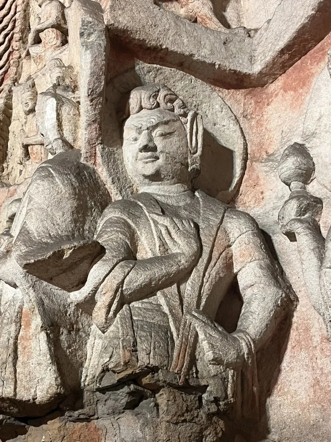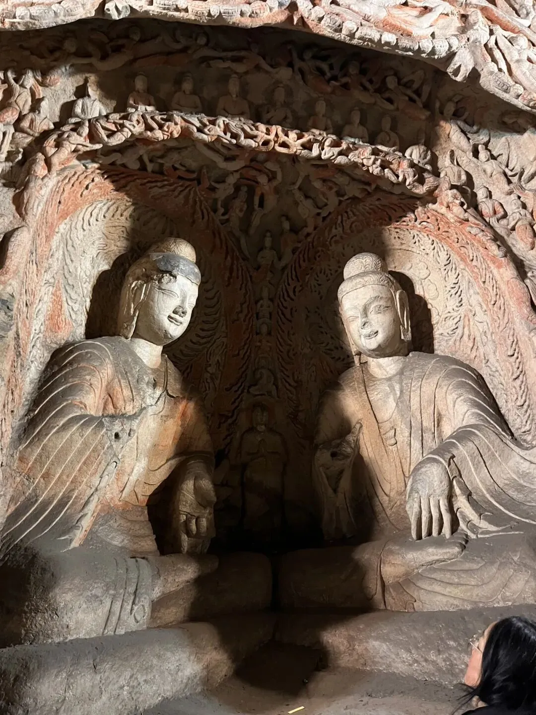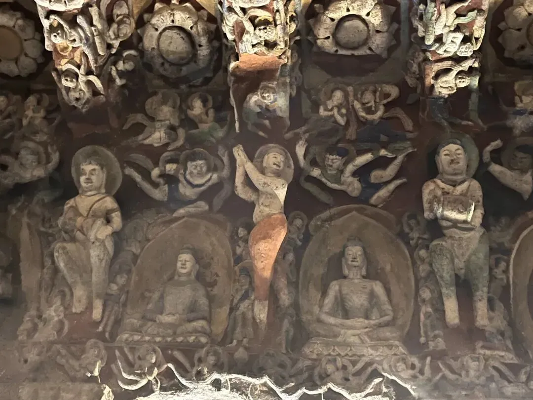 原为三大石窟,后加入的第四大石窟有争议,有说是麦积山石窟,有说是响堂山石窟,响堂山石窟是北齐皇家石窟。麦积山石窟以泥塑险绝入选。云冈石窟是北魏(公元386至534年)时期的皇家石窟,北魏鲜卑族拓跋氏从内蒙嘎仙洞西迁至平城,现在的大同,拓跋焘结束十六国的混乱局面统一北方和南方的刘宋对峙,形成南北朝,拓跋焘灭北凉后,从北凉迁3000户至平城,这其中有大量匠人和僧侣,这就有了建造石窟的基础,又有希腊,印度传过来的技术,于是云冈石窟不但融于西域和中原不同风格,还有希腊,印度的风格,也就是犍陀罗风格,这从佛像的体态,衣着和装饰的风格特点都看得出来。其中最著名的就是昙曜五窟,由高僧昙曜带领,为北魏五位皇帝建造的,这其中最出圈的就是第20窟露天大佛。第五第六窟有着隐喻冯太后和孝文帝二圣共治的二佛并坐,也很有特点。每个石窟内壁,布满了大大小小的佛龛,形态各异的佛,飞天,供养人,大量的忍冬纹,云雷纹等,对佛学佛教不甚了解,各种名字的佛叫不出名字,也分不清他们的区别。