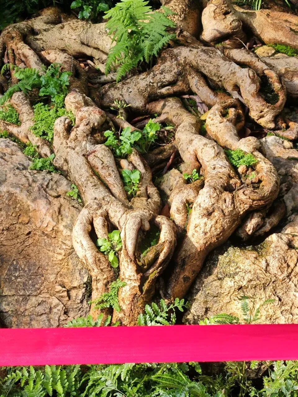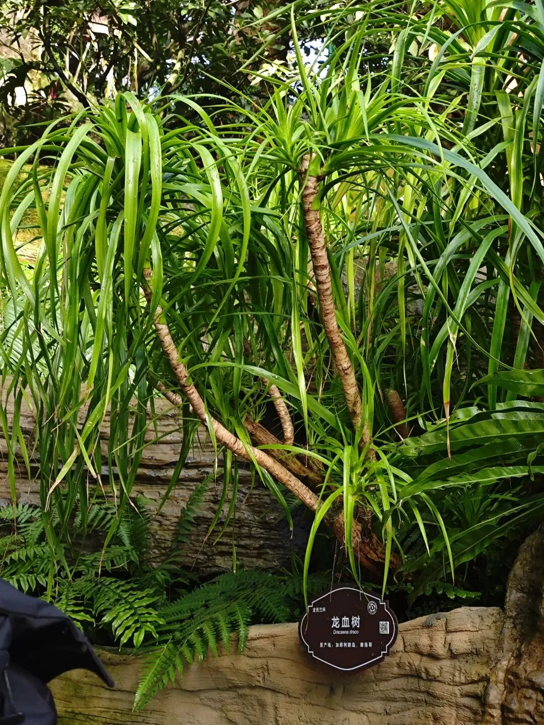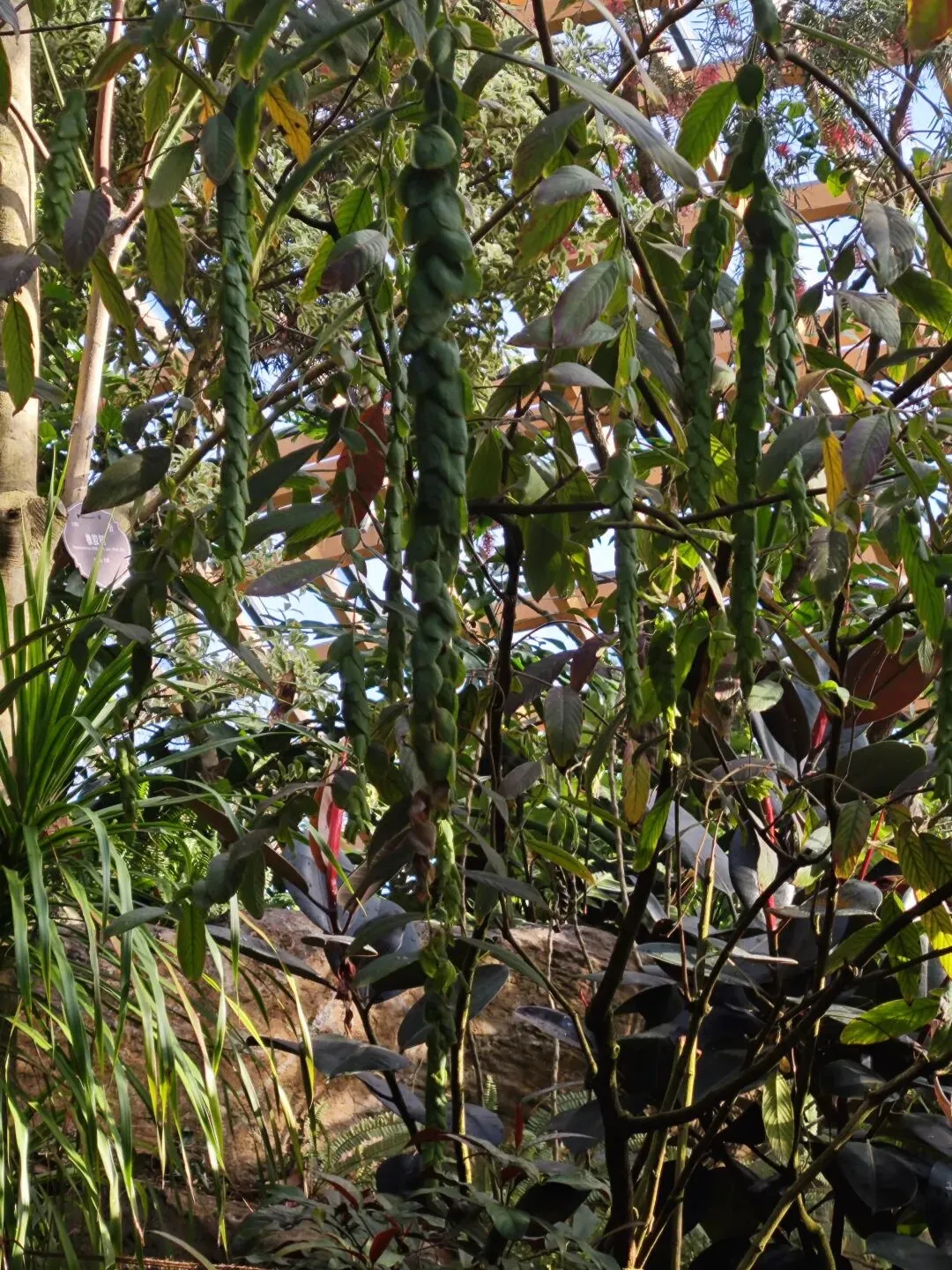 在这里,不仅可看到生长在南方的巴蕉、椰子树,还可看到犹如龙爪、爪爪深抓土地却又裸露在外的树根,还有那发着幽幽蓝色的仙人掌科、名叫“蓝柱锦”的植物,还有那叫不出名的花,扎根生长于石头缝的草,更有哪标签“见血封喉”的树,本来是在观赏植物,眼前却现出了武打片勇士拔剑出鞘、剑尖直抵对方喉咙的画面,我也有点哑然失笑,思绪居然跳跃到风马牛不相及的地方,也许是“见”与“剑”谐音的招惹?