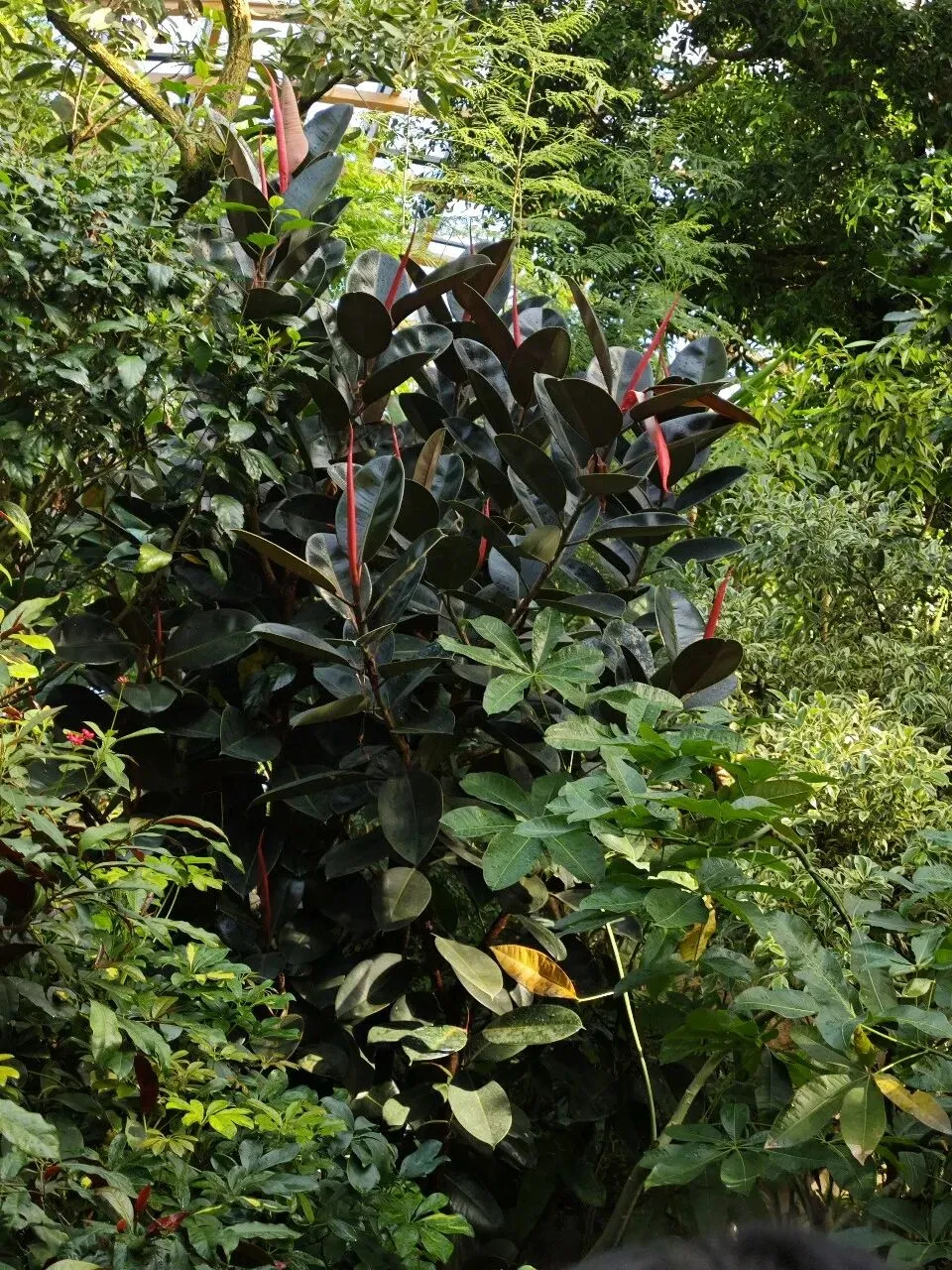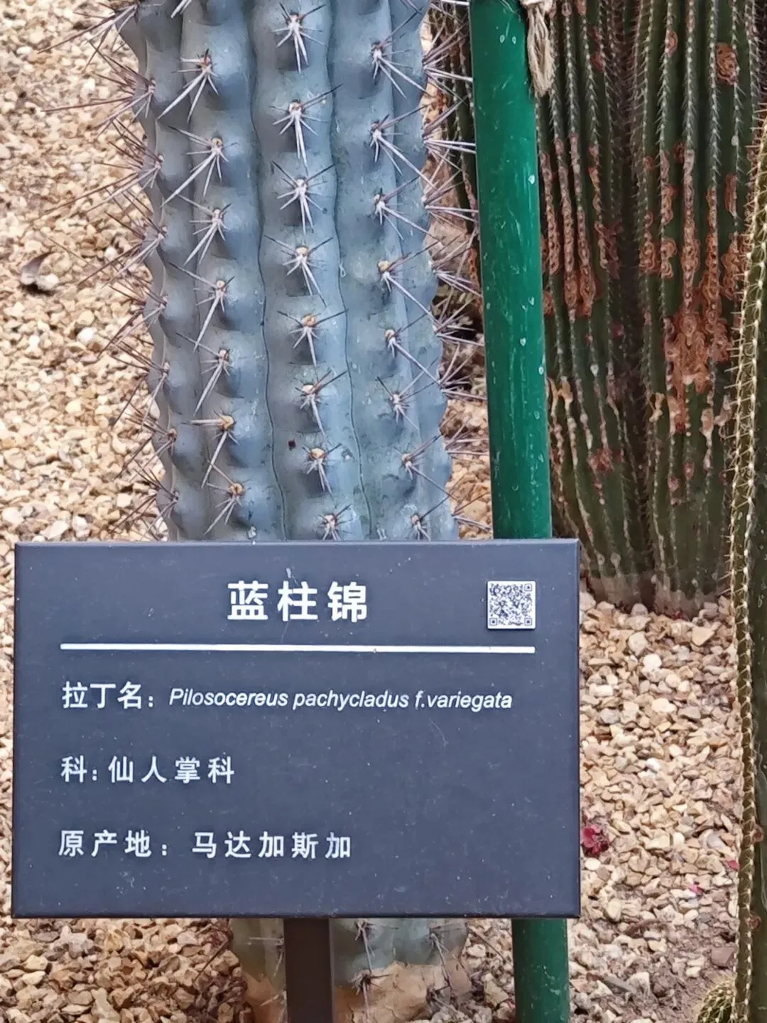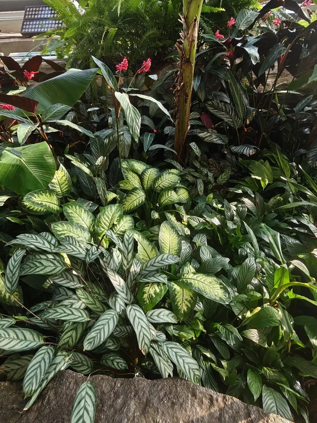 在这里,不仅可看到生长在南方的巴蕉、椰子树,还可看到犹如龙爪、爪爪深抓土地却又裸露在外的树根,还有那发着幽幽蓝色的仙人掌科、名叫“蓝柱锦”的植物,还有那叫不出名的花,扎根生长于石头缝的草,更有哪标签“见血封喉”的树,本来是在观赏植物,眼前却现出了武打片勇士拔剑出鞘、剑尖直抵对方喉咙的画面,我也有点哑然失笑,思绪居然跳跃到风马牛不相及的地方,也许是“见”与“剑”谐音的招惹?