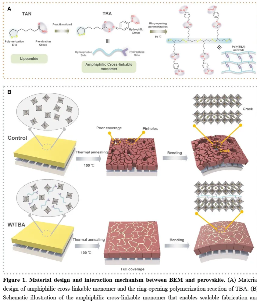这份研究是柔性钙钛矿太阳能电池产业化的重要突破,核心围绕两亲可交联单体TBA解决大面积制备的薄膜均匀性难题。