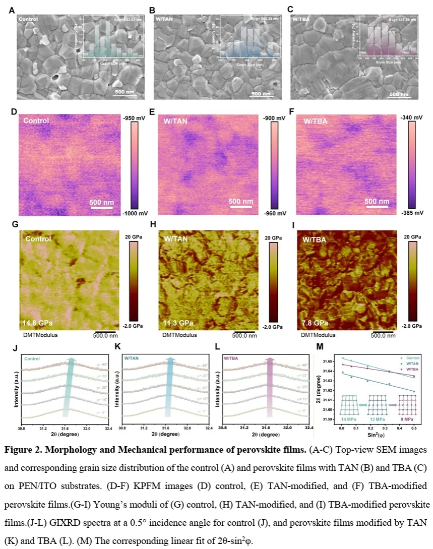 (1)两亲性单体设计:TBA兼具疏水与亲水端基,显著提升钙钛矿墨水在疏水基底上的润湿性与附着力,实现大面积均匀成膜。
