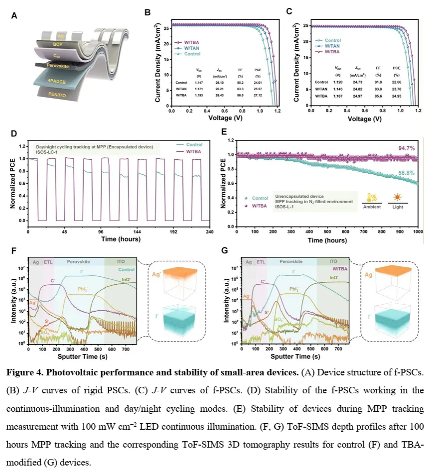 (2)高效柔性器件:柔性钙钛矿太阳能电池效率达24.95%,刚性器件效率突破27%,并兼具优异机械稳定性(万次弯曲后效率保持>90%)。