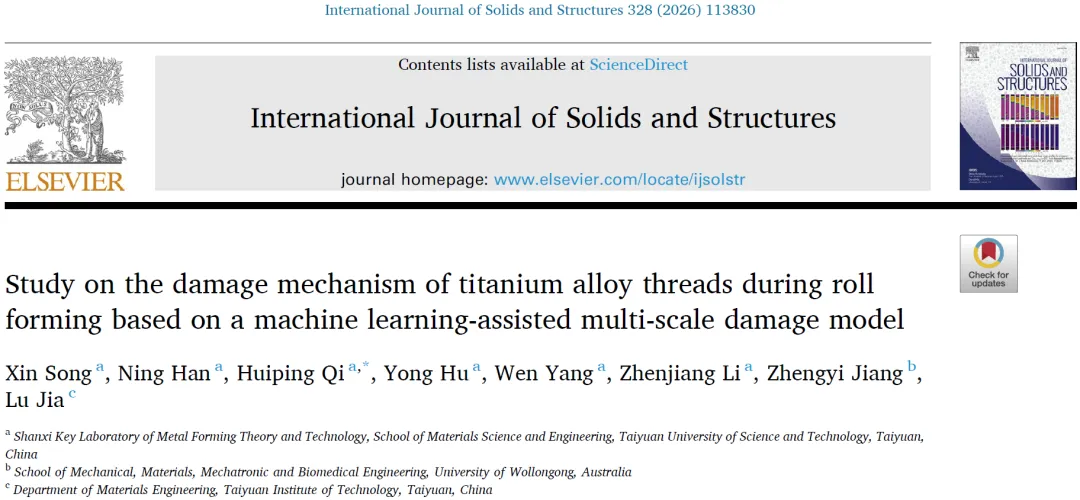 Song X, Han N, Qi H P, et al. Study on the damage mechanism of titanium alloy threads during roll forming based on a machine learning-assisted multi-scale damage model[J]. International Journal of Solids and Structures, 2026, 328: 113830.