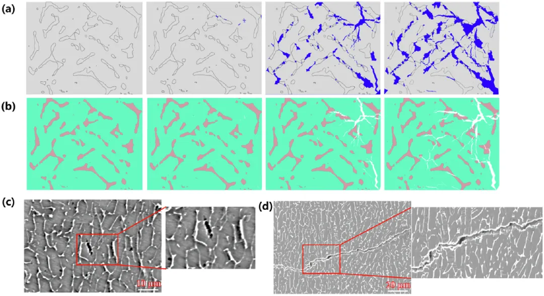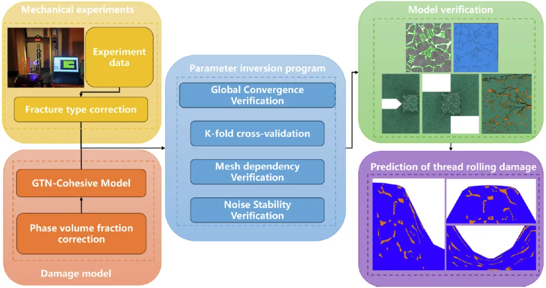 钛合金因其优异的综合性能被广泛用于航空紧固件,但其室温成形性差,在螺纹滚压成形过程中易产生裂纹等缺陷。针对这一问题,本文提出了一种基于机器学习辅助的多尺度损伤模型。研究通过耦合改进的GTN模型和内聚力模型,结合差分进化算法进行参数反演,并将图像识别重构的微观组织嵌入有限元模型,系统分析了双相钛合金在螺纹滚压过程中的损伤演化规律。结果表明,该模型能精准复现材料的宏观力学响应与微观裂纹扩展。研究揭示了损伤主要集中于牙根区域,且微裂纹萌生于α/β相界面,为钛合金塑性加工中的损伤预测与控制提供了理论框架。