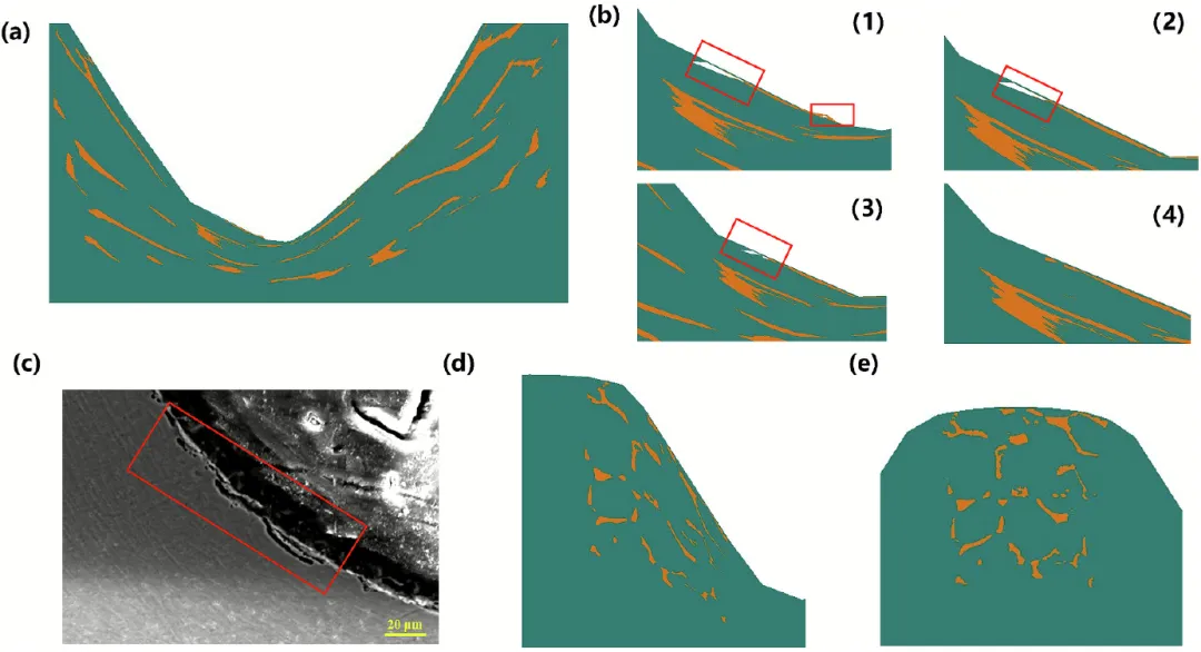 模型有效性:所构建的改进GTN-CZM耦合多尺度损伤模型,通过引入相体积分数和断裂模式修正项,能够准确预测双相钛合金在螺纹滚压中的宏观力学响应和微观裂纹扩展路径。