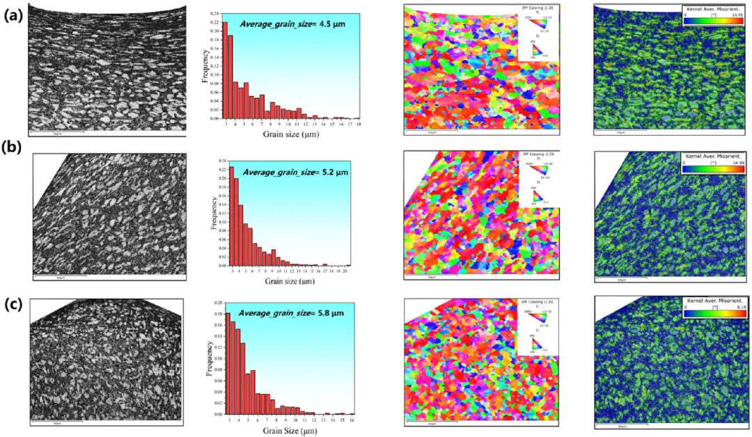 损伤机理与工艺指导:螺纹滚压过程中,损伤主要发生在牙根区域。这是由于几何应力集中与不利晶体取向(如基面滑移困难)共同作用,导致该区域位错密度激增,进而诱发α/β相界面萌生微裂纹。应变速率会显著影响损伤程度,速率越高裂纹扩展越快。而牙侧和牙顶区域因双相协同变形机制而保持完整。该发现为优化工艺参数、控制缺陷提供了直接的理论依据。