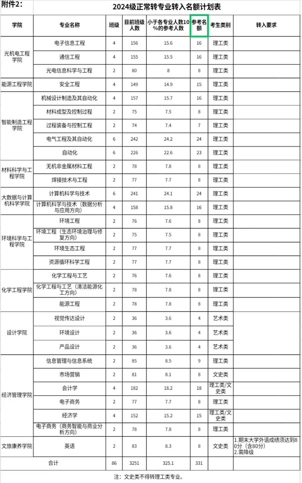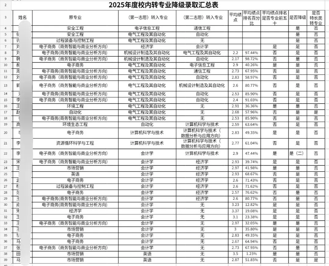 2025年6月23日教务处公示了正常、降级转专业拟录取36人名单,全部为降级转专业,转入人数较多的专业是会计学16人、电气工程及其自动化11人、计算机科学与技术2人、机械设计制造及其自动化2人。转出人数较多的专业为电子商务(商务智能与商业分析方向)15人、电子商务7人、市场营销4人、过程装备与控制工程2人、安全工程2人。