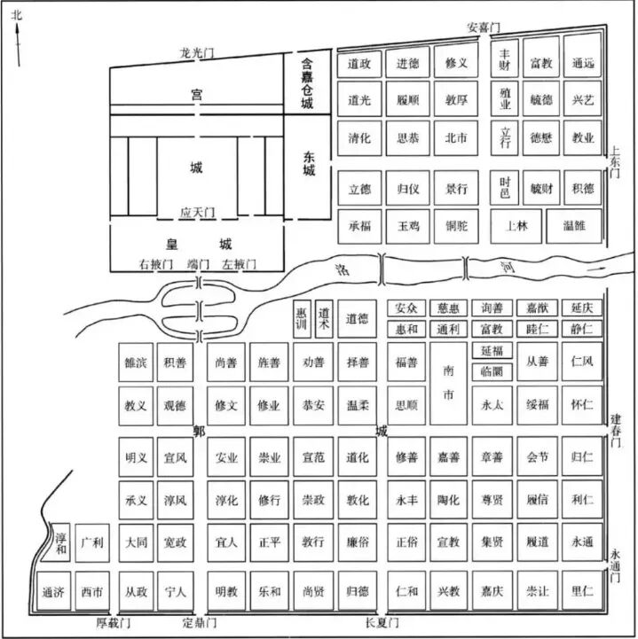 △无人机飞至东都洛阳城,悬停于位于建国门(唐朝更名为“定鼎门”)内的“明教坊”上空。