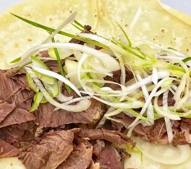 这可不是普通的饼。师傅在案板上把面甩得啪啪作响,薄如纸,圆如月。放在鏊子上烙得两面金黄,中间卷上切得薄薄的卤驴肉,再配上葱丝。咬一口,外皮酥脆掉渣,里面的肉汁瞬间在舌尖炸开,油润却不腻人,配上一口蒜,那滋味,绝了。