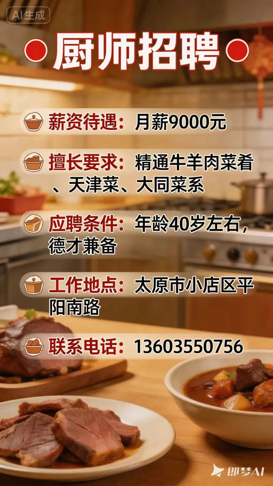 招聘:炒菜融合家常菜师傅1名,工资7500到8000,烧烤1名工资面谈,有意的兄弟们联系,地址:太原义井东衔,正月初七开门营业
