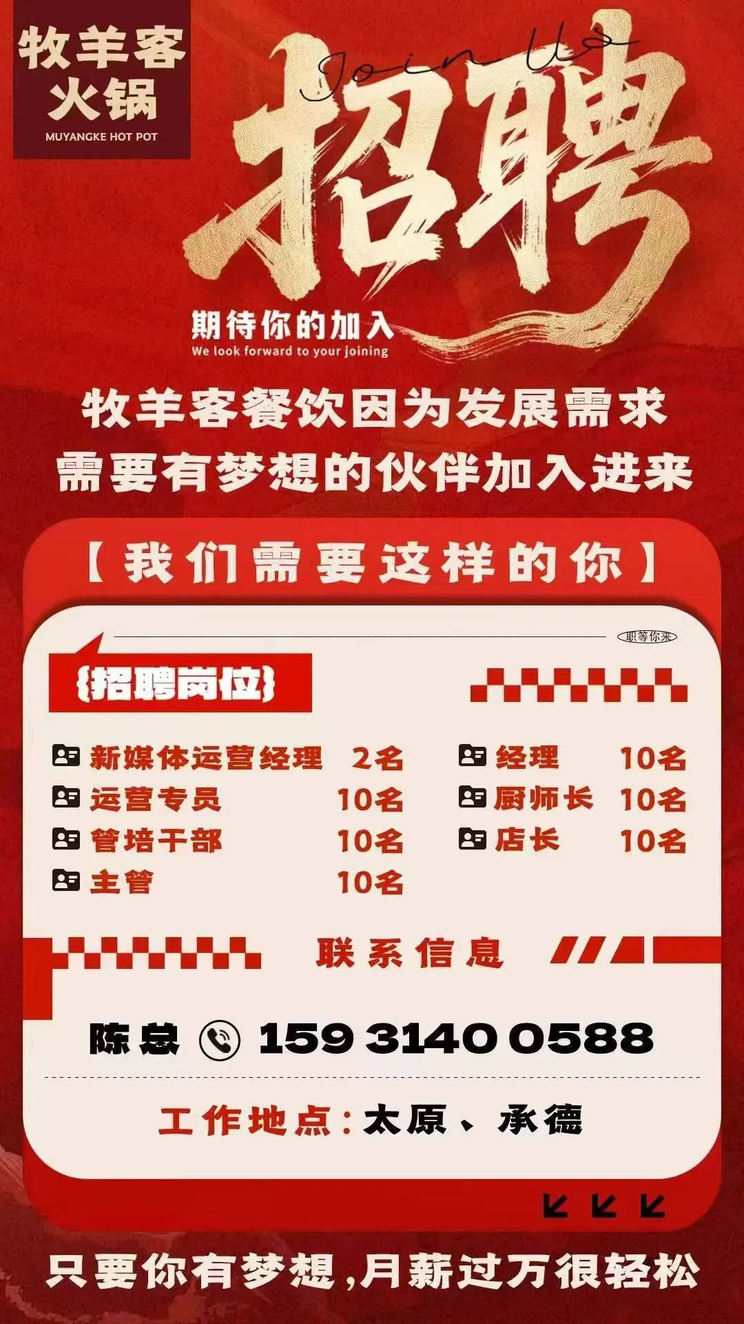 火锅店招聘:服务员数名年龄要求18—45岁,刨肉配菜2名,月休2天洗碗大姐每月15号开资。工资面议联系电话15934131150(微信同号)地址迎泽西大街海唐广场