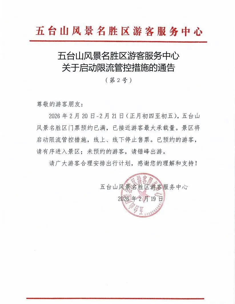 五台山发布限流公告五台山游客服务中心工作人员介绍,为有效应对客流高峰,中心已启动全员在岗服务模式,在售票口、检票口等关键区域增派引导人员、设置明显标识,确保入山流程高效顺畅。同时,景区组织志愿者在主要点位值守,为游客提供问询、指引等服务。在交通运力保障方面,景区智能调度中心将全天候监控客流变化,针对殊像寺、黛螺顶、五爷庙等热点区域,实行“车等人”动态调度模式,最大限度缩短游客候车时间。