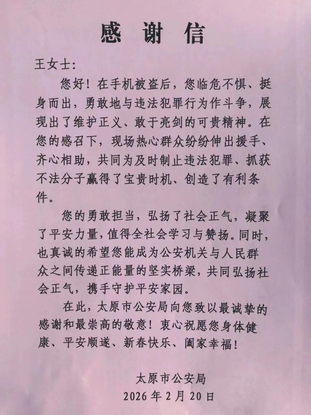 2 月 20 日大年初四一大早,太原市公安局情报指挥中心和迎泽分局相关负责人专程来到晋源某小区,将感谢信和慰问金送到王女士、呼女士手中,对她们勇敢制止扒窃、配合警方抓获嫌疑人的行为表示衷心感谢和崇高敬意。