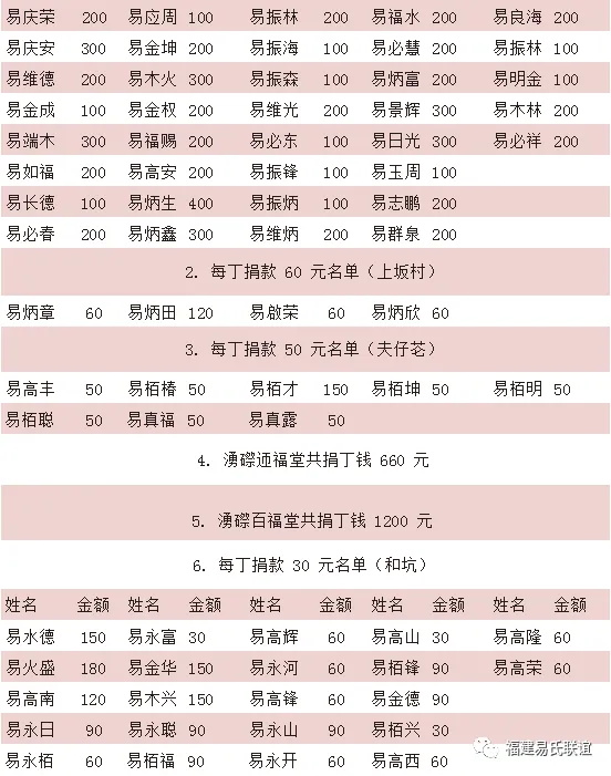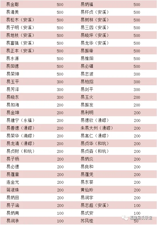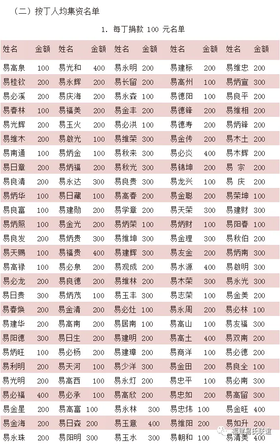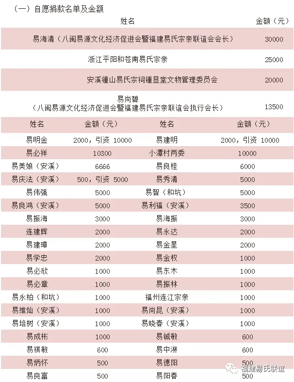 按照设计结构、造型、功能和建筑面积进行了测算,仅靠微薄的一点补偿款资金远远不够,缺口较大,为此由宗贤易金聪书写倡议书,向太原堂的各地易氏宗亲发出倡议:本村宗亲按男丁每丁至少捐献人民币 100 元;外地宗亲自愿捐献。宗亲们积极行动起来,群策群力,能力不分大小,捐款不分多少,出钱出力,人人都献出一片孝心、一点力量、一份贡献,万众一心,集我太原堂易氏宗亲之力,重建太原堂易氏宗祠,重振太原堂易氏雄风,共同完成重建宗祠大业。理事会决定将所有捐资者刻碑留念,万古流芳。为太原堂添砖加瓦增光彩捐款名单如下: