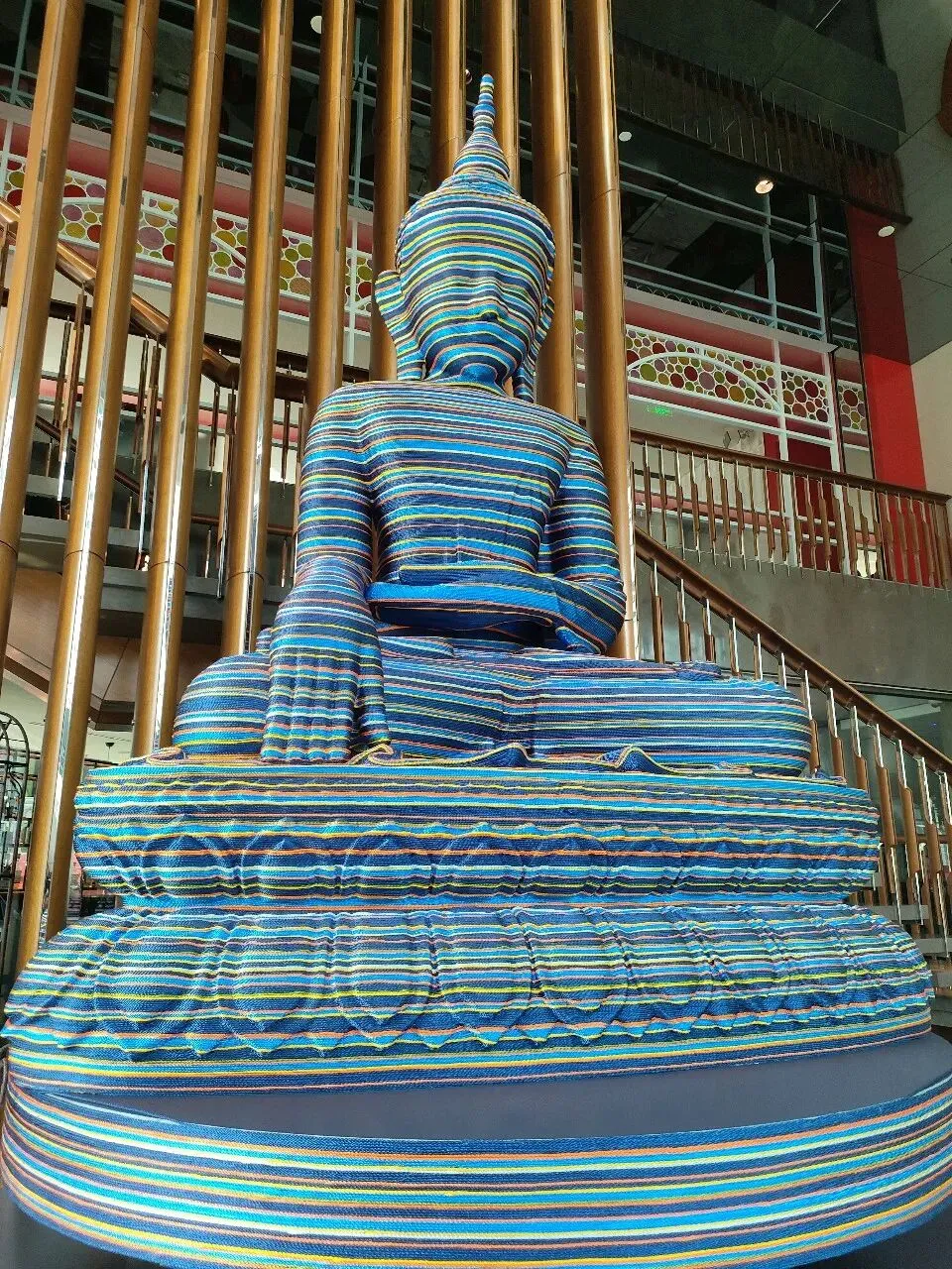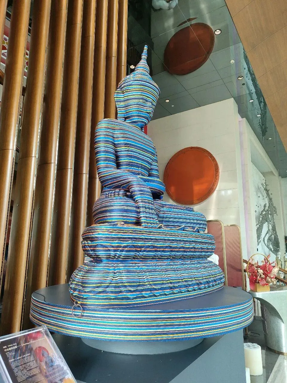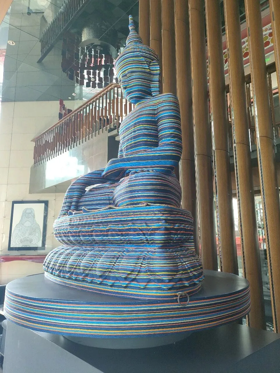 3. 材料的叙事性:彩色丝线不仅是包裹的材料,更成为一种时间的刻度。随着丝线的层层缠绕,佛像的轮廓逐渐模糊,象征着传统在当代语境下的被遮蔽与被重新发现。