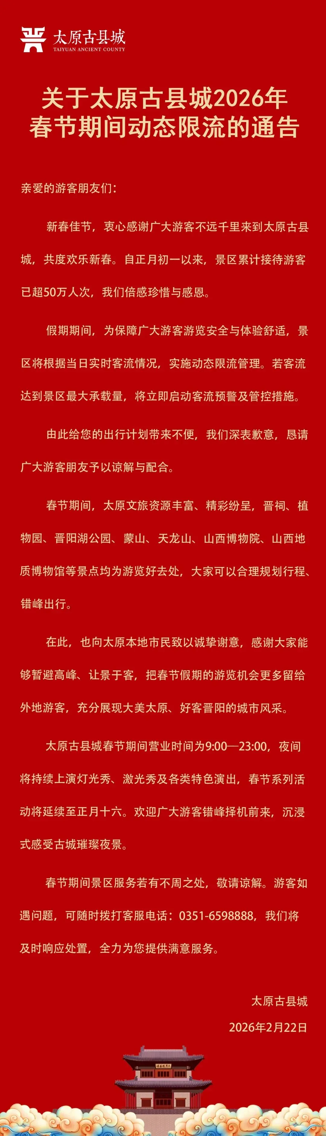 >关于太原古县城2026年春节期间动态限流的通告