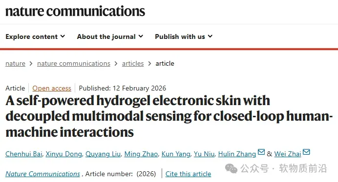 近日,太原理工大学张虎林教授、新加坡国立大学翟伟博士合作成功开发出一种基于聚乙烯醇(PVA)水凝胶的自供电电子皮肤,该器件通过集成热原电池、压离子和扩散三种机制,实现了对皮肤温度、动脉脉搏和汗液分泌的同步、自供电传感。该水凝胶电子皮肤具有高拉伸性(>800%)和低模量(<300 kPa),并通过独特的棱柱结构设计协同增强了离子极化效应。此外,研究团队还开发了一种结合局部注意力机制的时间序列机器学习模型,用于解耦多模态信号。基于此,团队进一步构建了一款主动式多模态信号发生器(AMSG)腕带界面,可同时实现生理检测、机器人控制及触觉反馈再现,为智能交互提供了一个高效的材料平台。相关研究以“A self-powered hydrogel electronic skin with decoupled multimodal sensing for closed-loop human-machine interactions”为题发表在《Nature Communications》上。