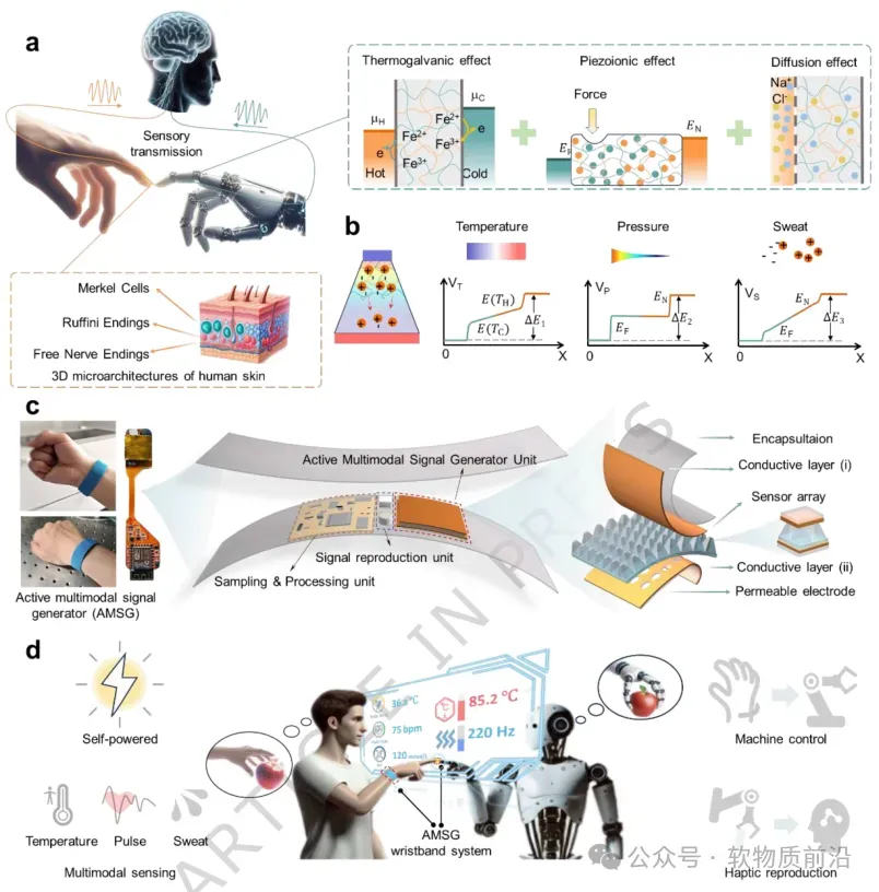研究团队从人类皮肤的感知机制中汲取灵感,将热原电池效应、压离子效应和离子扩散效应巧妙地集成于单一水凝胶材料中,分别模拟了皮肤中自由神经末梢的温度感知、梅克尔细胞的压力感知以及鲁菲尼末梢的电解质感知。为了协同这三种机制,水凝胶被设计成独特的棱柱结构,该结构能够将机械应力集中于尖端,并沿皮肤法线方向放大应力诱导的离子极化,从而显著提升输出电流和机械灵敏度。基于这一高性能的电子皮肤,团队进一步构建了一款高度集成的AMSG腕带。该腕带包含基于水凝胶的信号生成单元、信号复现单元以及信号处理与传输电路,所有电子元件均被柔性封装,为用户提供了一个舒适、可穿戴的人机交互平台。通过结合长短期记忆网络(LSTM)和卷积神经网络(CNN)等机器学习算法,该系统能够高精度地识别复杂刺激、响应手势指令,并再现来自机器人手指的触觉感受,为智能假肢、软体机器人和沉浸式虚拟交互等应用铺平了道路。