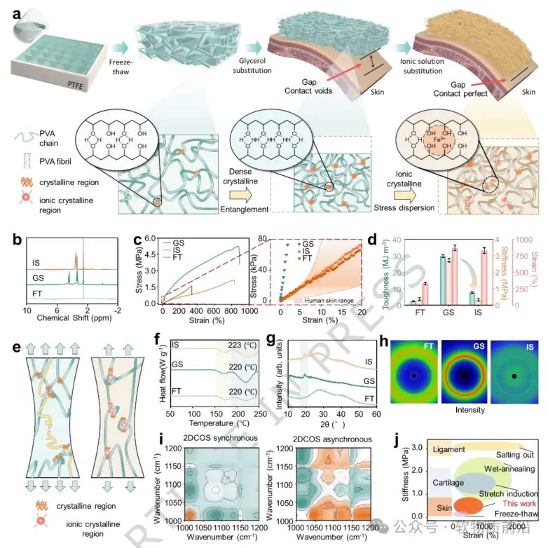 图2 通过顺序溶剂置换制备PVA水凝胶及其材料特性。 a 制备过程示意图,包括冷冻-解冻(FT)、甘油置换(GS)和离子置换(IS),逐步增强水凝胶网络。b FT、GS和IS在DMSO-d₆中于295 K下的¹H-NMR谱图。c 不同溶剂置换处理后PVA水凝胶的拉伸应力-应变曲线,与人体皮肤范围(橙色阴影区域)比较。d 不同处理后水凝胶的韧性和刚度。e 涉及致密结晶区和离子结晶区的机械增强机制示意图。f FT、GS和IS的DSC热分析图。g FT、GS和IS的XRD图谱。h 显示FT、GS和IS之间结晶度演变的WAXS图谱。i FT、GS和IS的同步和异步2D-COS图谱,其中红色和蓝色分别表示正强度和负强度。j 本研究中实现的水凝胶韧性与各种已报道水凝胶和生物组织的比较。