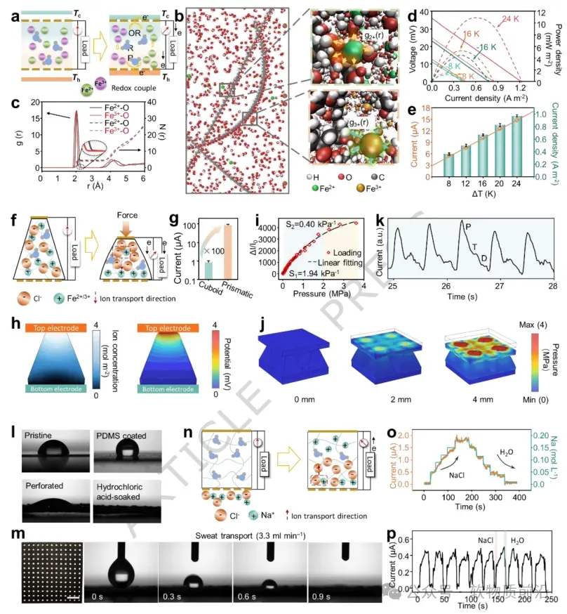 图3 多模态感知能力和机制。 a 作为温度感知机制的热伽伐尼效应示意图。b PVA链结构及其在Fe²⁺/Fe³⁺离子周围溶剂化行为的MD模拟,插图显示第一溶剂化壳层。c PVA水凝胶中Fe³⁺和Fe²⁺离子周围氧原子的径向分布函数g(r)(实线)和配位数N(r)(虚线)。d 不同温度梯度下的输出电压-电流曲线及相应功率密度。e 输出电流和电流密度作为温度差函数的关系。f 用于压力感知的压电离子效应示意图。g 使用棱柱结构在d33模式下增强离子压电输出。h 压力作用下离子浓度梯度和电位分布的COMSOL模拟。i 增加变形时PVA凝胶中应力分布的COMSOL模拟。j 相对电流变化作为施加压力的函数。k 从桡动脉脉搏测量的波形信号。l 不同碳纸表面:原始、PDMS涂层、穿孔和盐酸浸泡的接触角测量。m 汗液传输电极的顶视图及其传输能力(比例尺:1 mm)。n 用于汗液检测的扩散效应示意图。o 对不同汗液Na⁺浓度的电流响应。p 在NaCl添加和水稀释的10个交替循环中的重复电流响应。