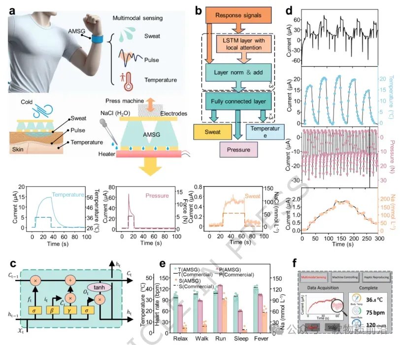 图4 通过机器学习模型解耦的多模态生理感知。 a AMSG腕带界面用于体温、脉搏和汗液分泌多模态感知的示意图,通过分别施加温度、压力和Na⁺电解质刺激模拟获得其特征信号。b 基于机器学习的信号解耦模型架构,包含三个具有局部注意力的LSTM层和三个全连接层,用于独立提取和解耦每种刺激的信号特征。c LSTM网络的内部结构。d 多刺激同时作用下的复合信号与其解耦分量的比较。e 不同活动状态(放松、行走、跑步、睡眠、发热)下体温、脉搏和汗液Na⁺浓度的多模态监测,与商用设备对比。f 显示多模态信号实时波形和相应监测输出的用户界面。