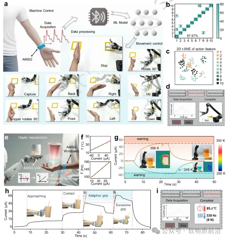 图5 通过基于手势的机器人控制和触觉反馈再现演示闭环人机交互。 a 使用AMSG腕带捕获手势并通过深度学习模型解释实现机械臂的实时控制。b 基于200个测试样本的电流信号序列,10种不同手势分类准确率的混淆矩阵。c 10种手势的主成分分析及其聚类分化。d 显示手势命令电流信号和相应机器人运动输出的用户界面。e 机器人手上AMSG检测到的温度和压力在用户腕带上再现的应用场景示意图。f 根据电流幅度调节温度和振动响应。g 机器人手接近或远离热源或冷源时AMSG的电流信号,通过光学和红外图像展示。h 抓握纸杯时的电流信号,通过幅度和切线角的变化确定适当的力量水平。i 显示实时触觉信号波形和触觉再现参数的用户界面。