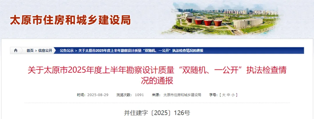 关于太原市2025年度上半年勘察设计质量“双随机、一公开”执法检查情况的通报时间:2025-08-29 来源: 太原市住房和城乡建设局 并住建字〔2025〕126号 各勘察、设计单位: 为进一步强化事中事后监管,规范勘察设计行业市场行为,不断提升建设工程勘察设计质量,根据《山西省住房和城乡建设厅关于做好2025年度建筑市场“双随机、一公开”执法检查工作的通知》(晋建市函〔2025〕346号)和太原市住建局《关于印发〈太原市2025年度勘察设计行业“双随机、一公开”执法检查工作实施方案〉的通知》(并住建函字〔2025〕93号),6月-8月我局开展了2025年度上半年勘察设计质量“双随机、一公开”执法检查,现将检查情况通报如下: 一、检查工作情况 本次勘察设计质量检查抽查范围包括2024年10月1日至2025年3月31日新申请及核发“主体施工阶段”施工许可证的项目及近年老年人照料设施项目,共抽查15个项目,涵盖学校、医院、托育机构、老年公寓、大型活动中心、住宅、办公综合楼、地下车库等类型,涉及设计单位15家、勘察单位11家。 检查内容包含技术检查和规范性检查。技术检查重点包括勘察设计文件违反有关工程建设强制性标准或涉及安全的非强制性建设标准情况、住宅隔声、串味、渗漏等技术措施是否满足规范要求情况、重要工程专家论证情况、违反编制深度规范要求等情况。规范性检查重点包括:是否落实《山西省住房和城乡建设厅关于加强建筑工程勘察设计质量管理的规定》(晋建质规字〔2023〕4号)《山西省房屋建筑和市政工程勘察设计重要工程施工图专家论证导则》(晋建质字〔2023〕72号)《山西省住房和城乡建设厅关于规范勘察设计文件上传“山西省建筑工程勘察设计质量和消防审查验收数字化管理平台”工作的通知》(晋建质函〔2020〕1237号)《山西省住房和城乡建设厅关于印发〈城镇住宅工程质量问题重点整治工作实施方案〉的通知》《关于加强施工图设计文件管理的通知》(并住建字〔2025〕27号)等文件要求,是否按照规定的施工图设计文件样式要求,对工程勘察报告、施工图设计文件进行签字、盖章等情况。 二、检查发现的问题 本次检查主要采用了专家审查、书面申诉复核、个别项目专家2次复核的方式,检查中主要发现存在以下问题: (一)专业技术问题 1.勘察专业方面 个别项目未附勘察任务委托书;缺少相关通用规范;地基复杂程度判定有误;部分勘探点间距不满足要求;未明确场地10KM范围内是否存在发震断裂;换填材料选用类型不适合;未提供近3-5年、历史最高水位调查结果;未提供砂土变形指标建议值等。 2.建筑专业方面 建筑专业存在设计深度不够、未提供计算书或计算书存在缺漏项等共性问题。个别项目建筑设计说明未明确防水挑檐禁止任何形式的封闭或改造;未按照绿色建筑等级标准进行设计和评价;未设置无障碍卫生间;素土夯实压实系数不满足规范要求等。 3.结构专业方面 结构专业存在设计深度不够、未提供计算书或计算书存在缺漏项等共性问题。个别项目加大截面框架梁箍筋直径间距不满足规范要求;个别边缘构件配筋不满足计算要求;错层处剪力墙配筋率不满足规范要求等。 4.设备专业方面 给排水、暖通、电气专业存在设计深度不够等共性问题。个别项目电动排烟窗出线回路断路器过负荷保护应作用于信号报警,不应切断电源;配电箱供电未采用双路电源在末端切换的方式;缺少防排烟系统设计基础要求;散热器安装前未进行水压试验;无绿色建筑专项设计等。 (二)规范性问题 部分项目的勘察设计文件对《山西省住房和城乡建设厅关于加强建筑工程勘察设计质量管理的规定》(晋建质规字〔2023〕4号)等规定的出图、签字、盖章程序执行不够到位;部分设计单位存在未将勘察设计文件上传至“山西省建筑工程勘察设计质量和消防审查验收数字化管理平台”(以下简称平台)或上传后未进行办结,上传资料不完整不规范的问题。 三、有关处理意见 依据《建设工程勘察设计管理条例》《关于加强建筑工程勘察设计质量管理的规定》(晋建质规字〔2023〕4号)及有关文件要求,对本次检查中违反勘察设计政策法规规章和技术标准规范比较严重的相关责任单位和责任人公布如下: 四、下一步工作要求 (一)限期整改到位。各有关勘察设计单位要针对项目存在问题,逐项进行整改,形成整改报告,通报发布10日内将整改报告报太原市住建局321室。整改完成后的勘察设计文件及变更要及时上传到平台。 (二)严格落实规范。各有关勘察设计单位在上传勘察设计文件至平台后必须同时进行办结,否则将以未上传进行督导。凡涉及变更设计的必须符合相关法律法规及标准规范(重要工程实施过程中,如发生布局、功能、结构形式、系统方案等涉及安全的重大变更,应重新申报进行专家论证),变更设计文件必须上传平台,我局以上传平台的所有文件为最终勘察设计成果进行认定。 (三)增强责任意识。各勘察设计单位要严格落实主体责任,强化专业技术人员责任意识,进一步健全质量管理体系,强化勘察设计质量管理,严格按照建筑工程质量、工程建设强制性标准进行设计;全面落实勘察、设计项目负责人和专业技术人员的质量安全责任,加强对勘察设计人员的教育培训,切实提高勘察设计水平。严格按照相关法律法规、标准规范进行
