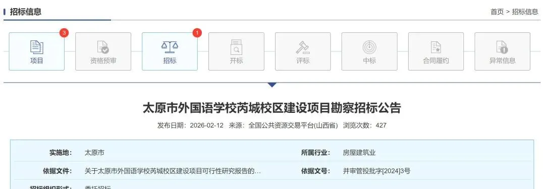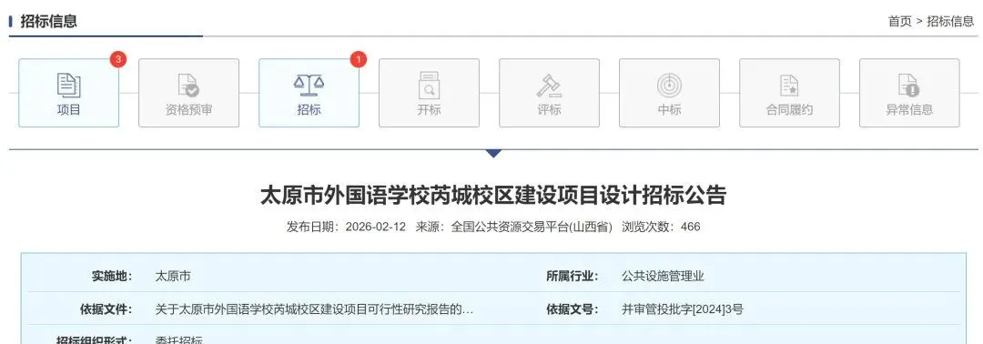 太原市外国语学校是山西省唯一在国家教育部备案具有外语特色的首批重点中学,是被国家教育部确定为具有向高校推荐保送生资格的全国17所外国语学校之一。截至目前太原市外国语学校教育集团共分为四个校区:漪汾校区、摄乐校区、开城校区以及凤凰校区。在2024年初召开的市委经济工作会议中提到太原市外国语学校将新增一个校区:外国语芮城校区。消息一出引起了周边市民的急切关注,纷纷期盼落地。今年1月,官方发布了该学校所处地块的控规修改方案。此次控规修改将地块各项指标作出细化调整:容积率1.0,建筑密度30%,绿地率13%,建筑高度25米。直到近日(2月12日),官方最新发布了太原市外国语学校芮城校区建设项目勘察与设计招标公告。本太原市外国语学校芮城校区建设项目已由项目审批/核准/备案机关批准,项目资金来源为市财政资金,招标人为太原市城市建设管理中心。本项目已具备招标条件,现进行公开招标。