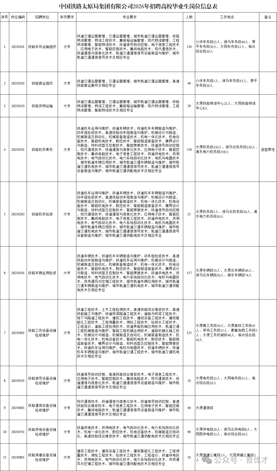 中国铁路太原局集团有限公司根据企业发展需要,现将2026年全日制普通高等职业院校高职(大专)毕业生招聘有关事项公告如下: