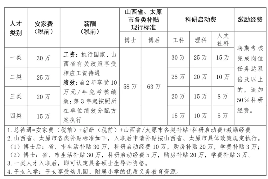 根据拟引进人员的教学科研水平,学校对引进人才分为四类。对于条件优秀者,团队可在学校待遇基础上叠加: