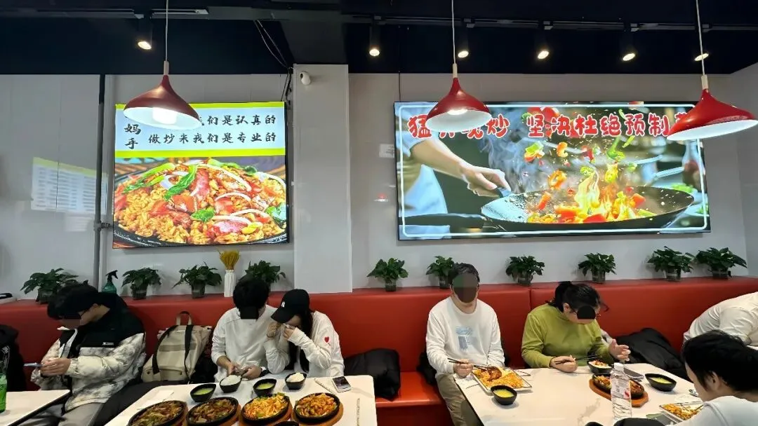 “山大妈妈手”几个字在略显拥挤的街道上格外显眼。店里红色卡座几乎坐满,墙上挂着“做炒米我们是认真的、专业的”和“猛火爆炒 坚决杜绝预制菜”的标语。
