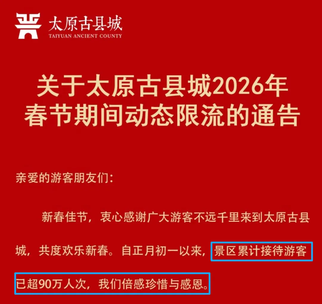 自正月初一以来,景区累计接待游客已超90万人次。(太原古县城官方2月23日发布)