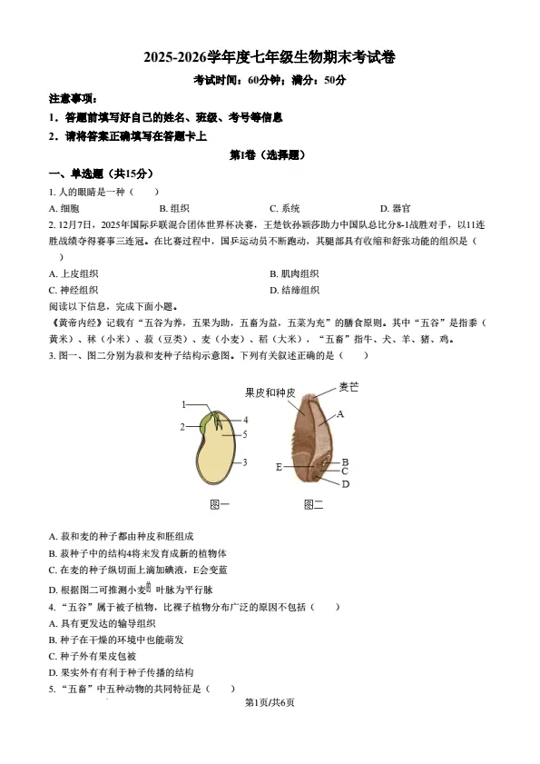 七年级生物:山西长治武乡县2025-2026学年第一学期七年级期末试题分享