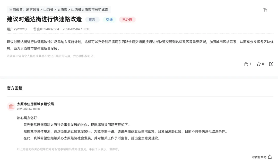 官方明确答复:根据城市总体规划,通达街规划红线宽度50m,为城市主干路,道路两侧商业及住宅密集,且紧贴道路红线,目前不具备快速化改造条件。这一答复从城市规划的现状和工程实施的客观条件出发,解释了当前无法推进快速化改造的具体原因。