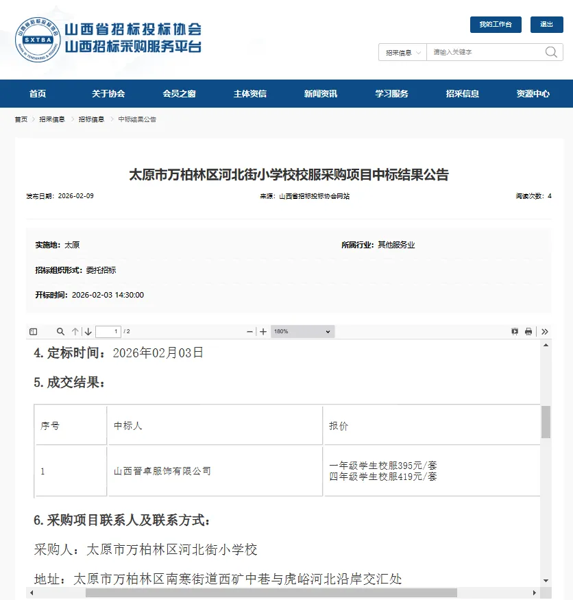 太原市万柏林区河北街小学校学生校服采购项目于2026年2月3日在山西省太原市小店区晋阳街和泰花园北区北门10号楼2单元1102室召开了评标会议,秉承公平、公正、科学择优的原则进行评标,现将评标结果公示如下: