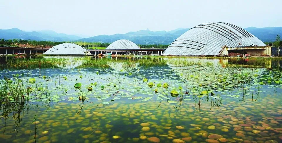 太原植物园3座展馆犹如颗颗露珠镶嵌在湖边。本报记者阮洋摄